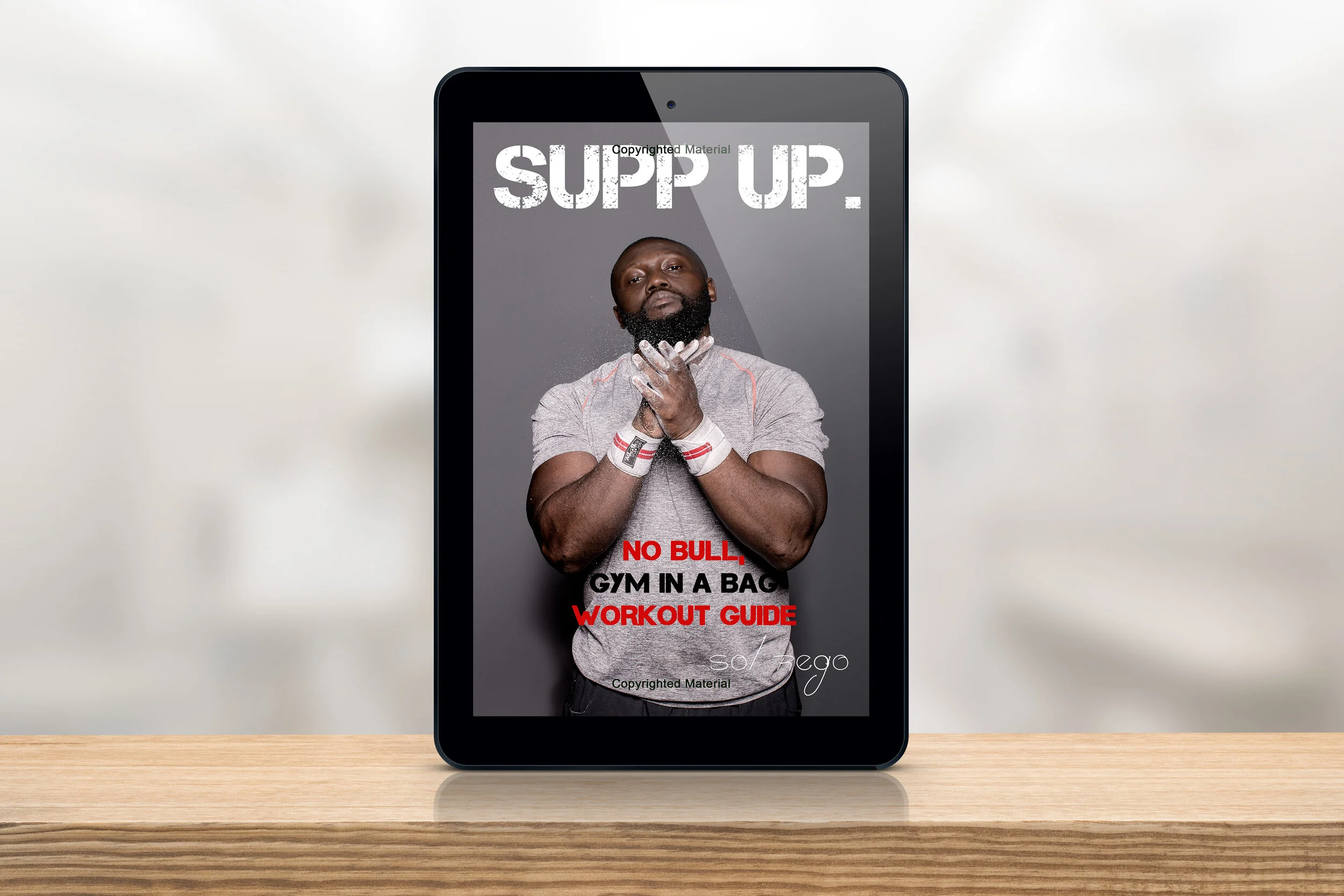 SUPP UP. No Bull, Gym In A Bag Workout Guide gives you tools and knowledge on how to maintain your current fitness levels through simple and effective, but challenging methods while away from home – without breaking the bank.